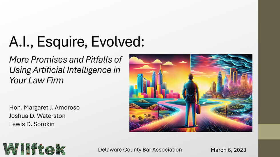 Joshua D. Waterston and Lewis D. Sorokin educated lawyers and paralegals about the use of Artificial Intelligence (AI) by law firms during this presentation at the Delaware County Bar Association on November 29, 2023. AI chatbots have become useful tools for the public, and AI could transform the practice of law through efficient research, analysis, and even document preparation. However, lawyers must follow ethical requirements, such as client confidentiality, as they leverage this new technology.